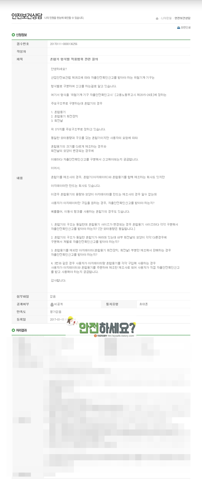 오늘은 혼합기 자율안전확인신고 형식별 적용범위에 대해서 안전보건공단에 문의를 넣었습니다.