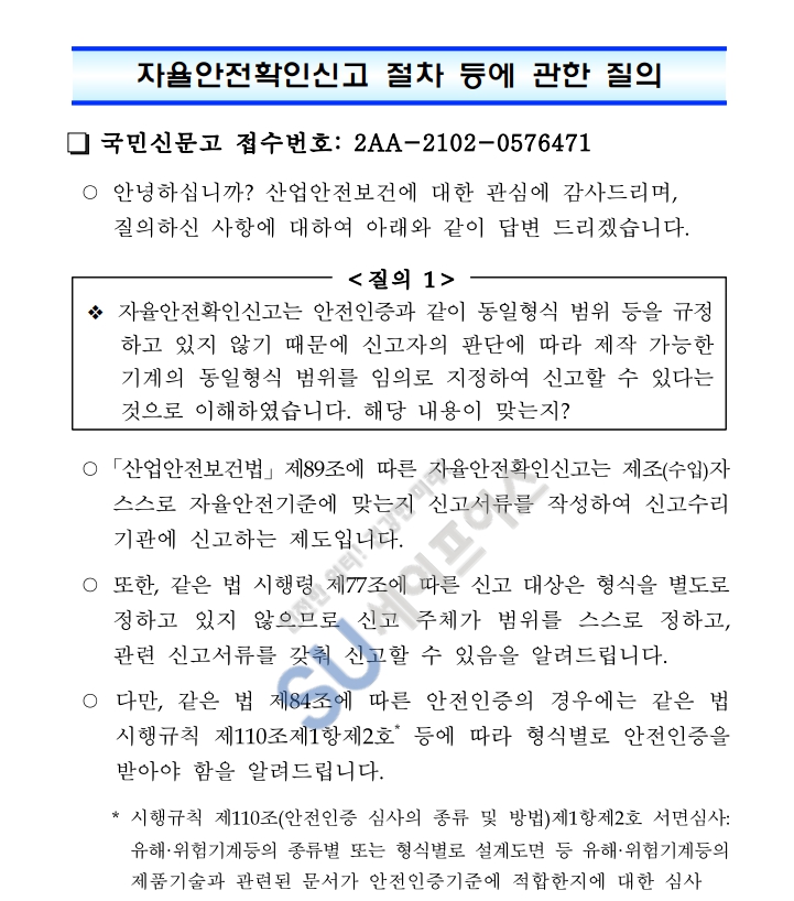 사진1에 <질의1>화 같이 고용노동부 답변에 따라 자율안전확인신고는 안전인증과 다르게 신고 대상은 형식을 별도로 정하고 있지 않고 신고 주체가 범위를 스스로 정하고 관련 서류를 갖춰 신고할 수 있음을 알려드린다고 답변이 되어있습니다.