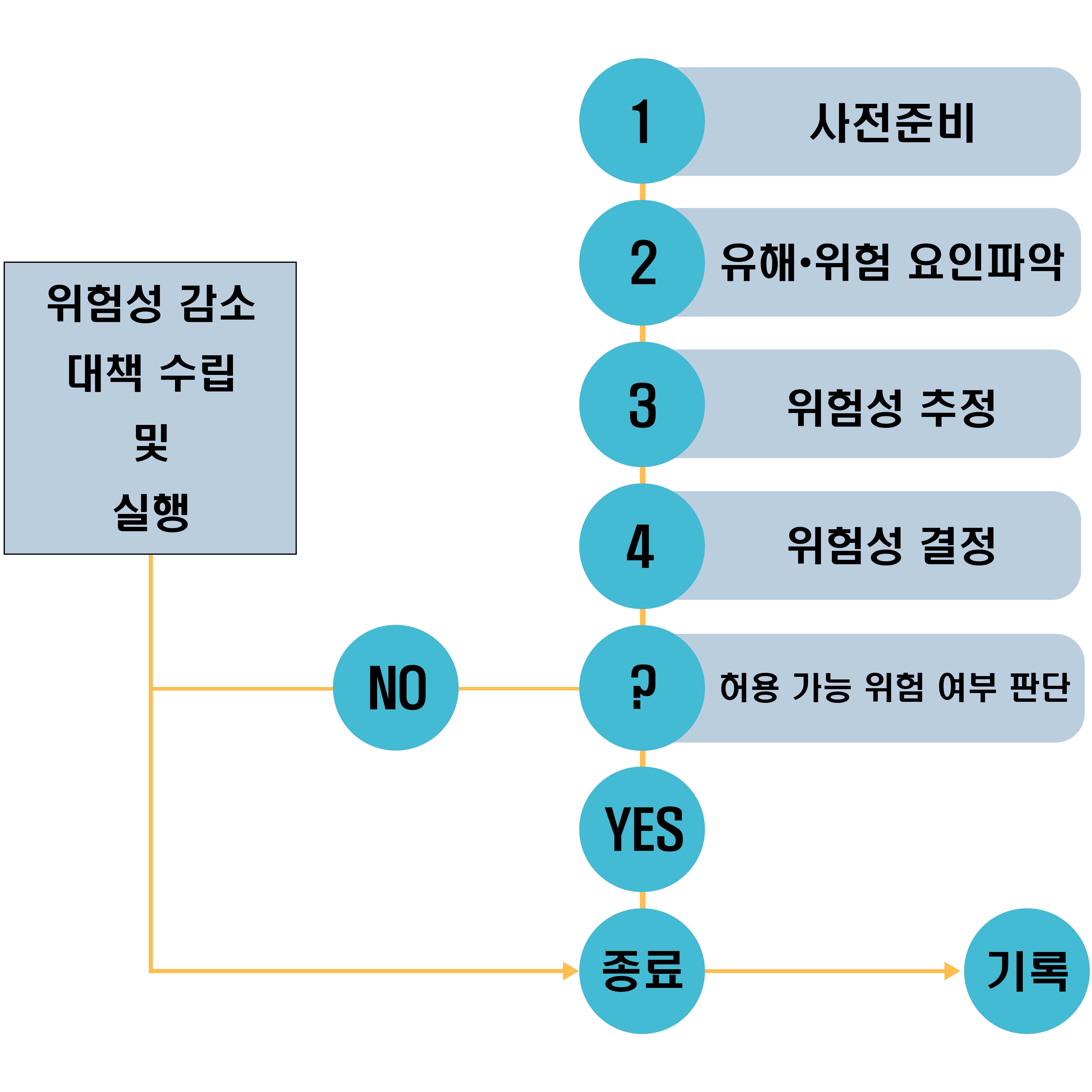 1. 사전준비 : 위험성평가 실시규정 작성, 평가대상 선정, 평가에 필요한 각종 자료 수집