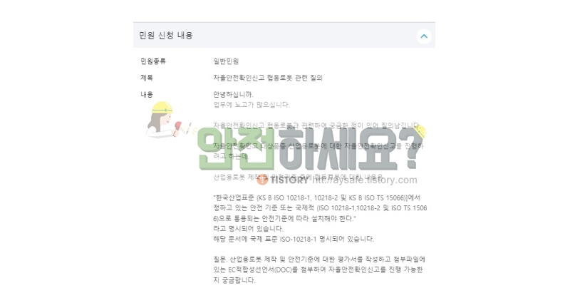 그래서 자율안전확인신고 서류에 협동로봇은 어떤 인증을 더 추가해서 제출해야하는지 국민신문고에 질의회시를 남겼습니다!