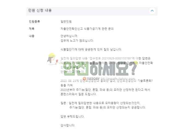일전에 질의답변 내용 "접수번호 20210929*000015578"에 대한 답변은 식품가공기계의 절단기능을 수행하는 모터의 용량을 합산하여 자율안전확인대상 여부를 판단하라고 했는데, 2023.08.23에 안전보건공단과 통화한 결과, 안전보건공단의 기술토론회를 거쳐 2023년부터 주기능(절단, 혼합, 파쇄 등)의 모터만 산정하면 된다고 해서 혼란스워서 질문 드립니다.