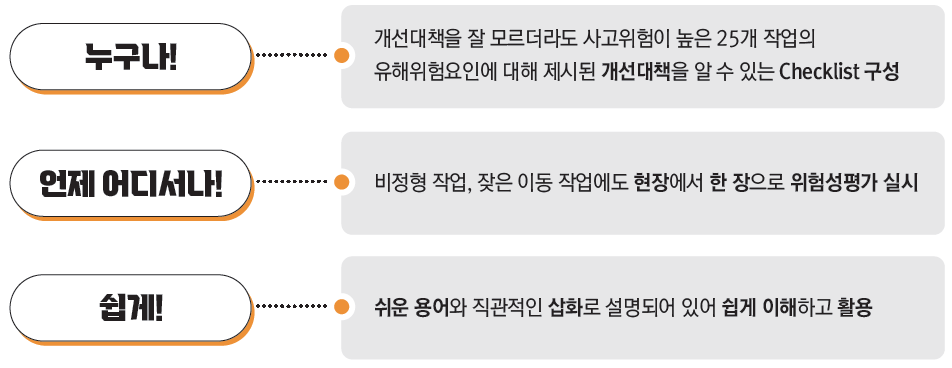 누구나 개선대책을 모르더라도 사고위험이 높은 25개 작업의 유해위험요인에 대해 제시된 개선대책을 알 수 있는 체크리스트 구성