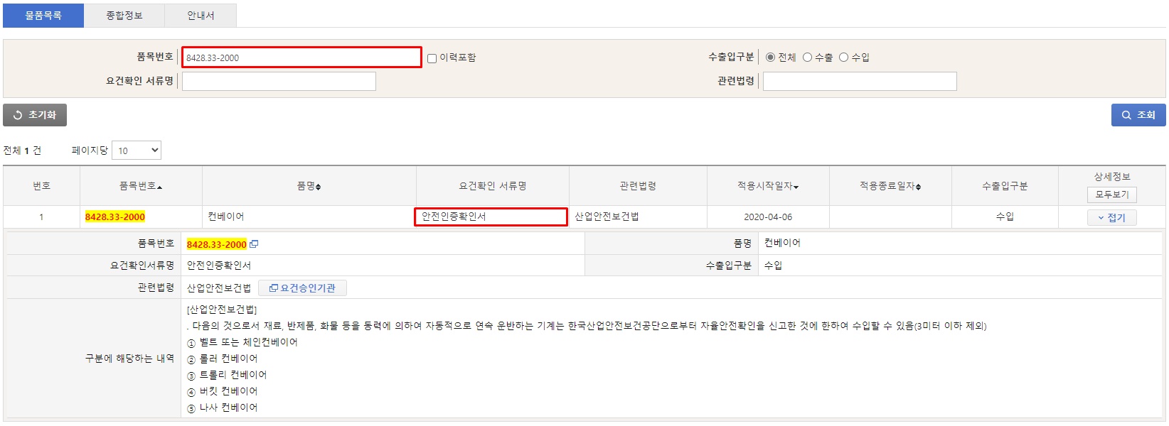 아래 사진과 같이 품목번호 검색시 요건확인 서류에 안전인증확인서라고 노출됩니다.