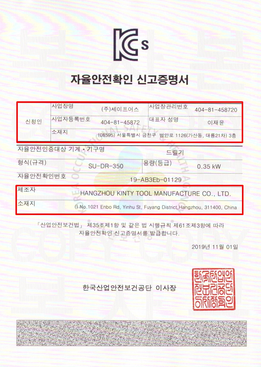 예를들면 신고 증명서에 있는 'HANGZHOU KINTY TOOL MANUFACTURE CO., LTD. 회사에서 제조한 동일한 기계라고 하더라도, 해당 증명서는 (주)세이프어스라는 신청인(수입자)가 신고한 것이기 때문에 이 증명서는 (주)세이프어스에서 수입하는 기계만 사용이 가능합니다.