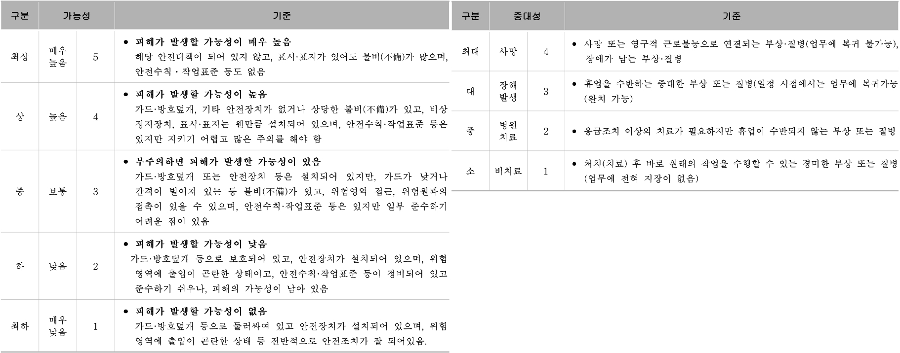 두번째 위험성의 수준과 그 수준을 판단하는 기준, 허용 가능한 위험성의 기준은 일반적으로 실시규정 내에 포함하여 작성합니다. 가장 많이 사용하는 빈도·강도법을 기준으로 아래 <표 1>과 같이 가능성(빈도)과 중대성(강도)의 기준을 정하고, <표 2>과 같이 그 크기를 조합하여 허용가능한 위험성 기준을 확정합니다.