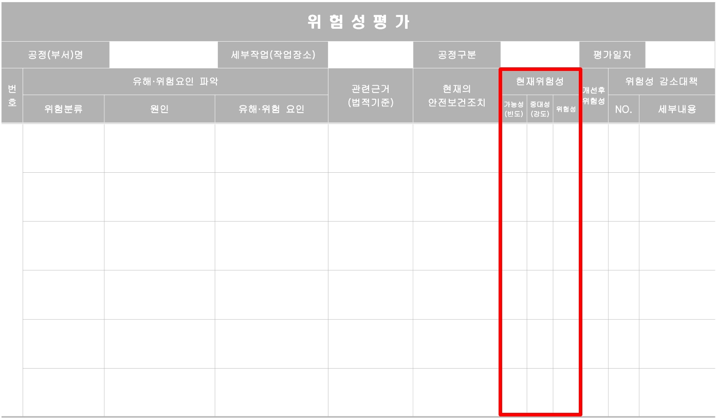 예를들면 곱셈법 기준으로 가능성이 3점이고, 중대성이 3점이라면, 위험성은 9점으로 작성하시면 됩니다.