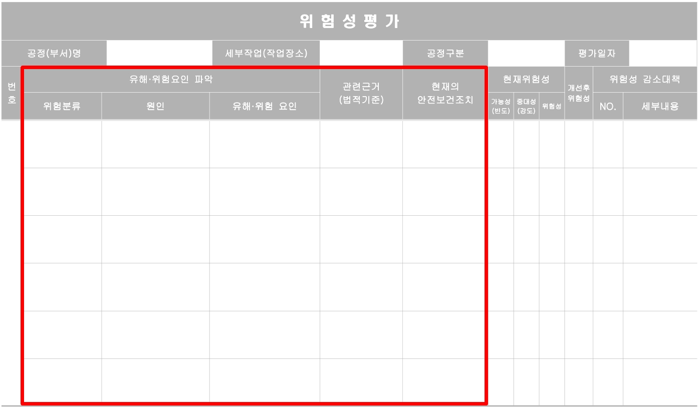 위험성 평가는 근로자 참여가 중요하기 때문에, 사전조사 단계부터 아래 '위험성평가 참여자 현황' 양식을 활용하여 근로자 참여 내역을 작성해 두는 것이 좋습니다.