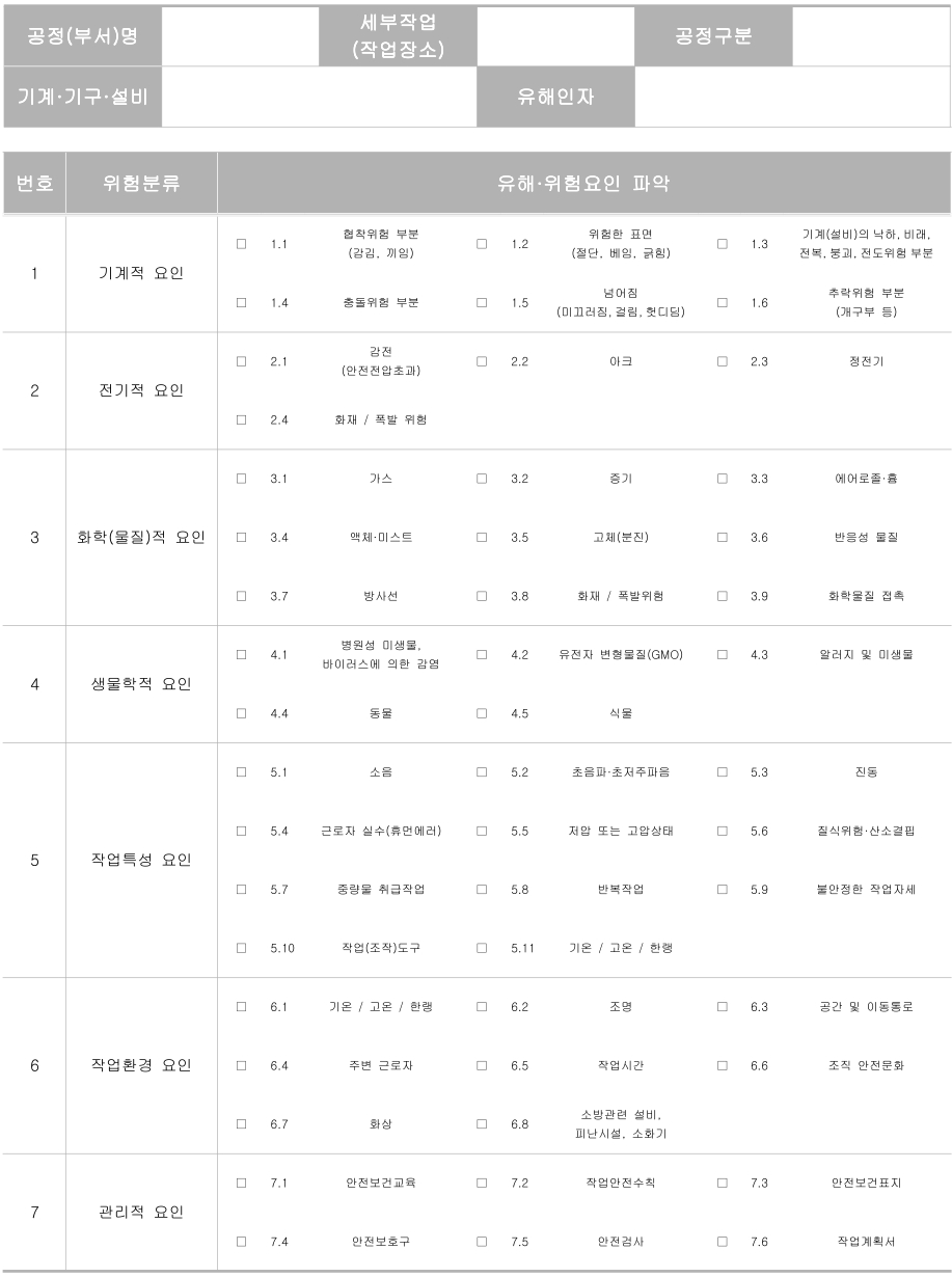 사업장 순회점검에 의한 방법으로 위험성 평가가 불가능한 경우 아래 위험성평가 청취조사표 양식을 활용하여 실시하셔도 됩니다.