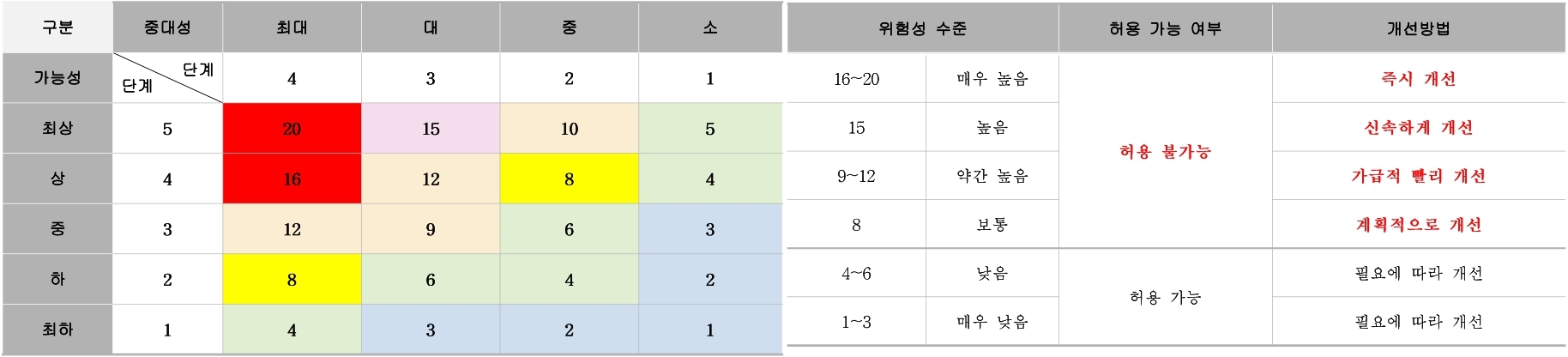 예를 들었던 현재의 위험성이 9점이면, <표 2>에서 허용가능한 위험성의 범위를 최소 6점으로 확정하였기 때문에 허용불가능한 위험성으로 결정하시면 됩니다.