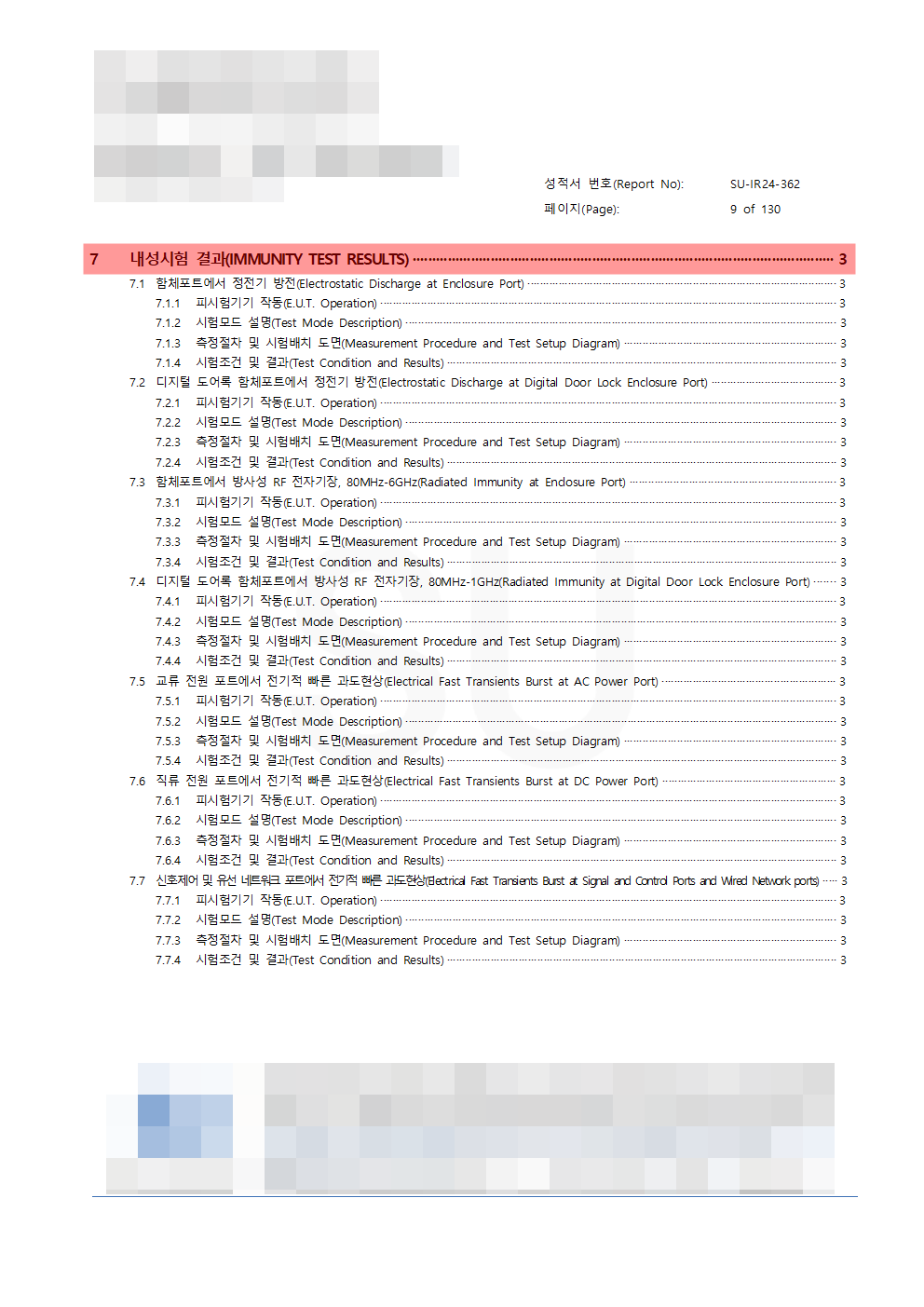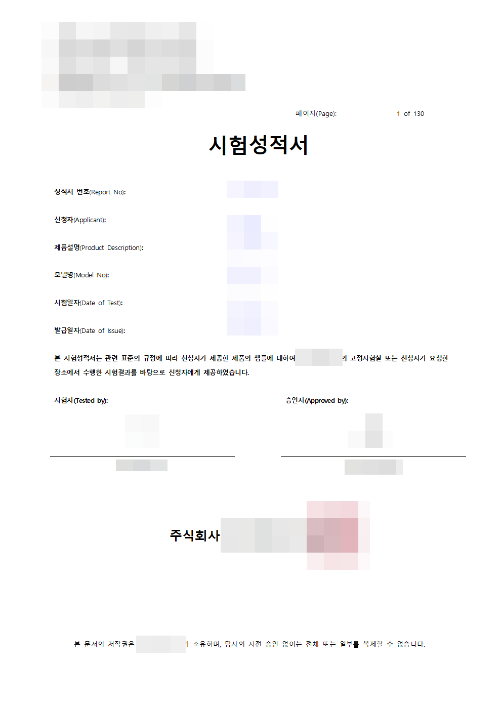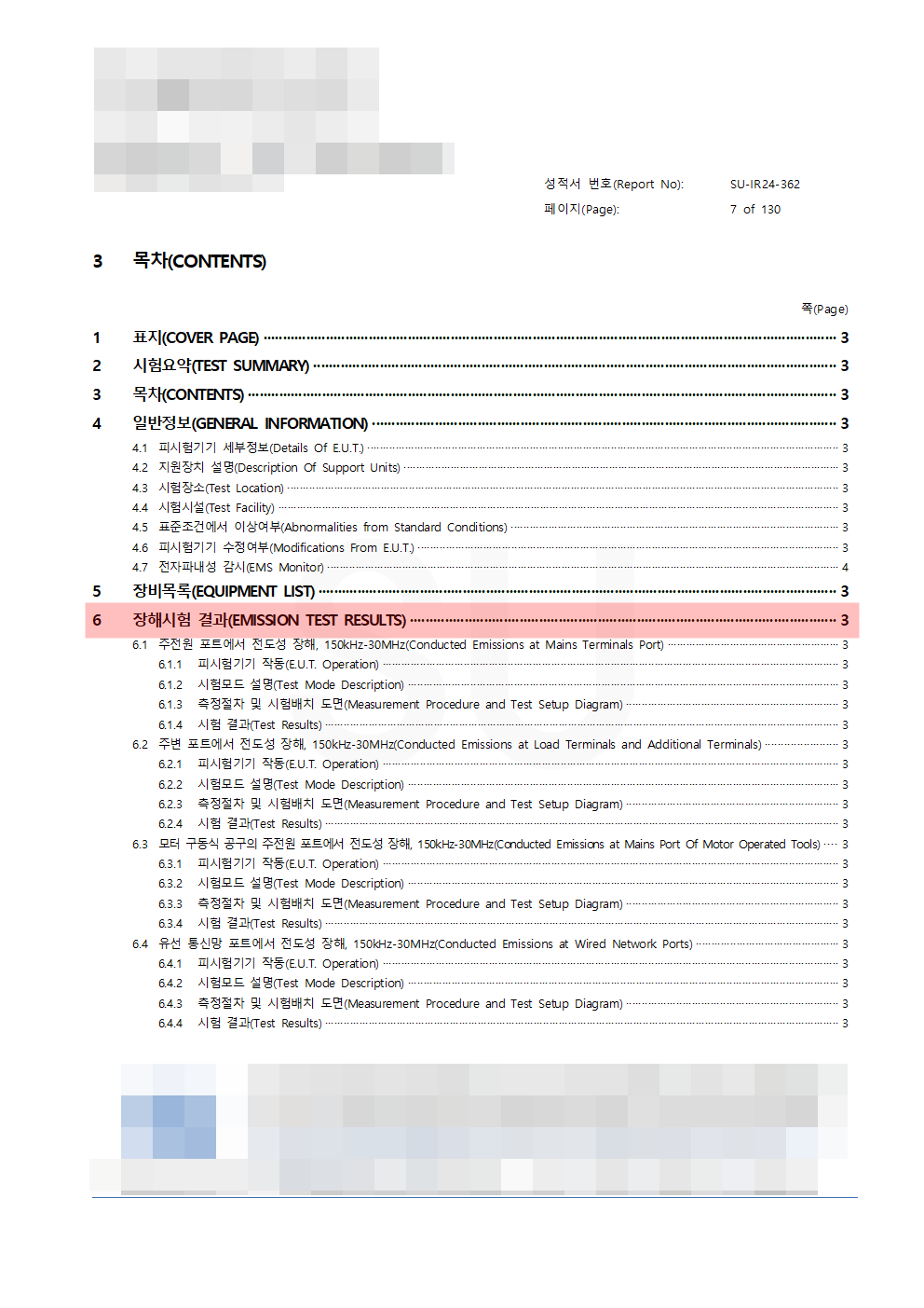 전자파 시험(EMC TEST)이 끝나면 아래와 같이 전자파 시험성적서를 고객에게 제공합니다.